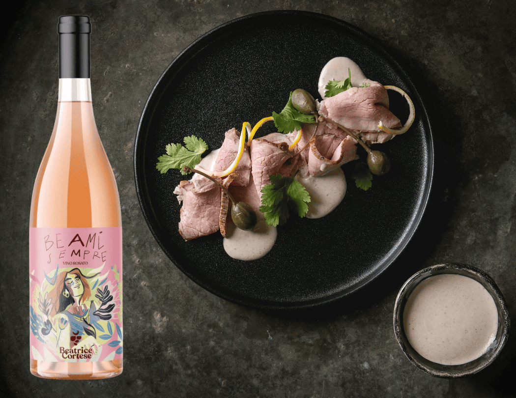 Il tenero vitello tonnato, con la sua salsa vellutata a base di tonno e capperi, trova il perfetto equilibrio nel Rosé “Beamì” di Beatrice Cortese: la sua fresca acidità e i sentori di fragola e lampone esaltano la delicatezza della carne e contrastano la sapidità della crema tonnata, offrendo un’esperienza di gusto armoniosa e avvolgente
