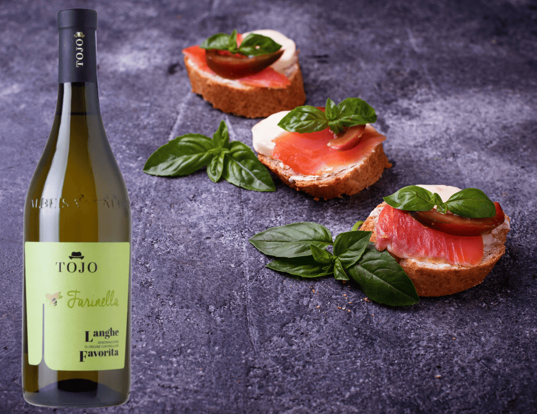 Il crostino croccante con salmone affumicato trova nel Favorita “Farinella” di Tojo un abbinamento ideale: la sua freschezza agrumata e i delicati profumi floreali equilibrano la sapidità del pesce, creando un connubio elegante e armonioso.